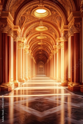 A long, golden corridor with a patterned marble floor leads to a doorway. The space is lit by natural light streaming through the hall.