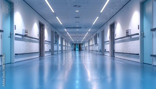 A long hallway with white walls and blue floors. The hallway is empty and the lights are on