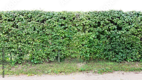 A long hedge of cut decorative hawthorn bush. Isolated on top