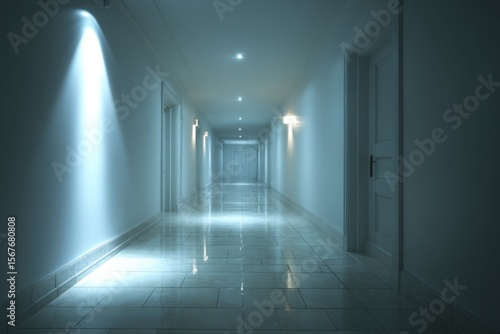 A long hotel hallway is softly illuminated by lights, creating a calm ambiance. The polished tiles reflect the glow as doors line each side