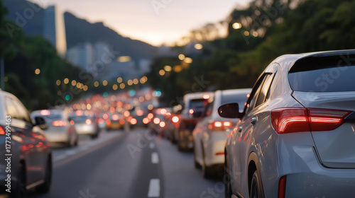 A long line of vehicles stuck in traffic on a busy highway after a road accident, with emergency lights visible in the distance, symbolizing urban congestion, transportation challenges, and the