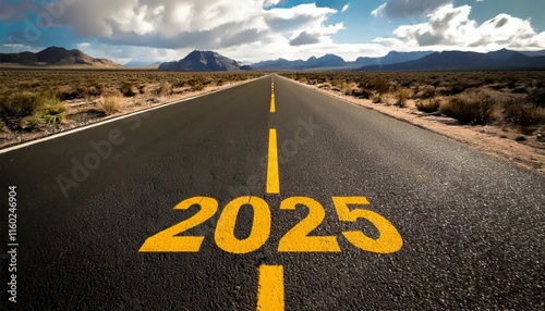 A long, open road stretches into the distance, marked with "2025" on the asphalt, surrounded by desert landscape and mountains under a cloudy sky.