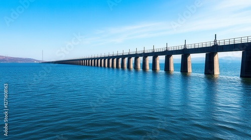 A long pier extends over calm waters under a clear blue sky, creating a serene and picturesque landscape.