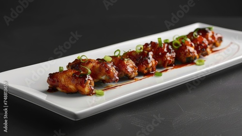 a long rectangular white plate featuring succulent chicken wings coated White Barbeque Sauce, perfectly arranged and garnished with freshly chopped green onions.