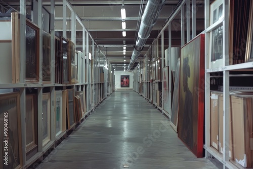 A Long Row of Framed Artworks Stored in a Warehouse