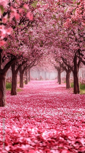 A long scenic walkway is surrounded by cherry blossom trees, pink petals coat ground