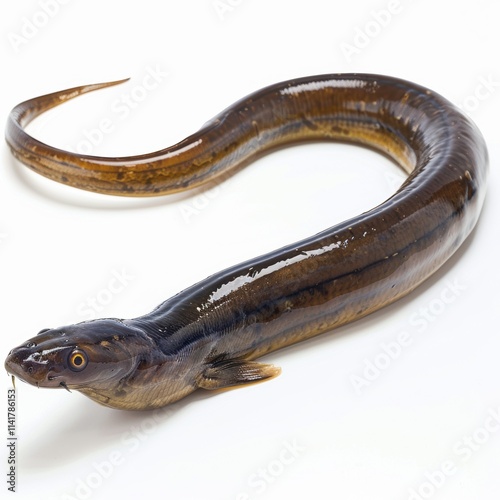 A long, slender eel with a glossy, dark brown body and prominent yellow eyes, resting on a white background.