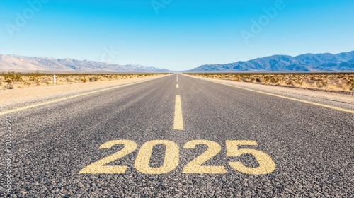 A long, straight road stretches towards mountains, marked with the year "2025" on the asphalt, under a clear blue sky.