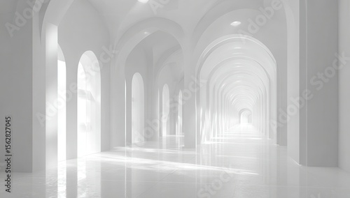 A long, white hallway with arched ceilings and walls, illuminated by soft light, creating a sense of depth and serenity