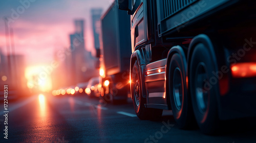 A lorry truck is stuck in a traffic jam on a highway lane hyper realistic vehicle details with vivid textures moody shadows on the road bright saturation in urban elements