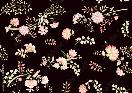 A lot of different fantasy flowers. Millefleurs trendy floral design. Blooming midsummer meadow seamless pattern. Seamless pattern, background. Vector illustration. Gradients colors