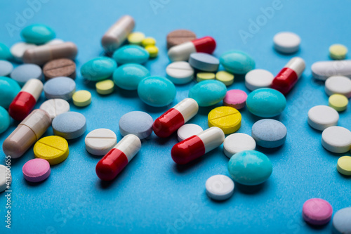 A lot of multicolored pills and capsules on a blue background as a concept of addiction from medicine. Vitamins to keep immunity on a high level.