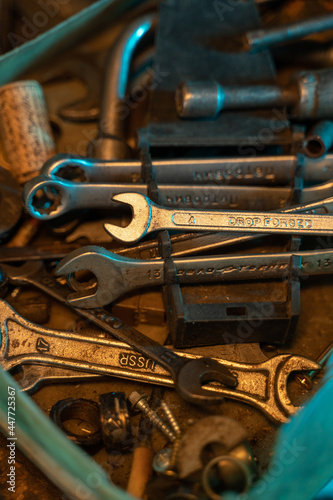 A lot of old rusty instruments in vintage dirty garage