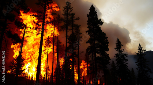 A lot of smoke in forest fire scene. Tall trees engulfed in flames and thick smoke rising. Ecology problems
