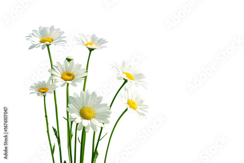 A lovely collection of beautiful white daisies with bright yellow centers and delicate petals, set against a pure white background