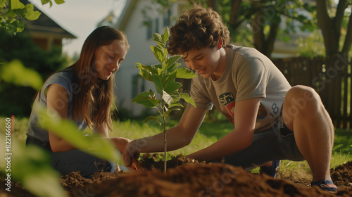 a lovely teenage girl and boy planting a tree in the yard, laughing,staring at each other lovingly,full of vitality