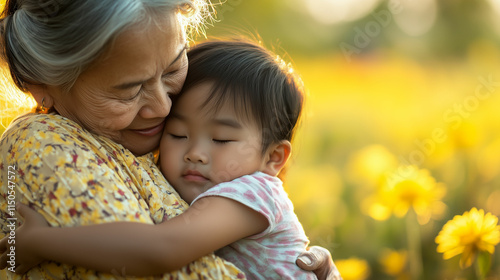 A loving Asian grandmother embraces her sleepy granddaughter in a vibrant flower field during golden hour. Generative AI