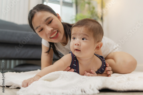 A loving mother spends quality time with her baby, helping him practice tummy time, rolling, and sitting up. These tender moments reflect family bonding, care, and child development at home.
