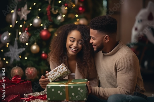 A loving pair exchanging gifts under a beautifully decorated Christmas tree, embodying the spirit of holiday love, creativity with copy space