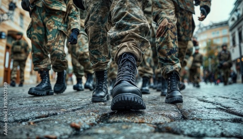 a low-angle, first-person perspective view of a line of soldiers marching forward on a cobblestone street.