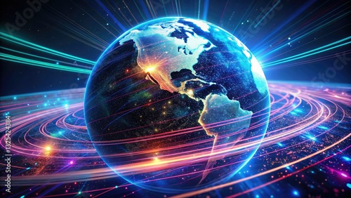 A low-light digital Earth glows, showcasing global network communication via vibrant data flow.