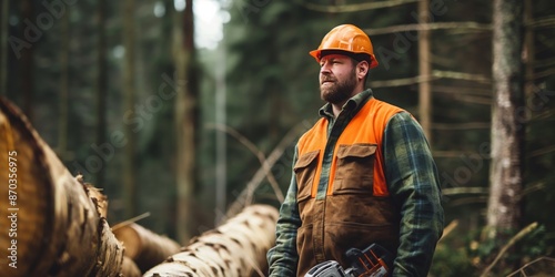 A lumberjack in workwear and hardhat operates a chainsaw amidst a dense forest setting.
