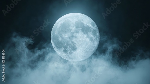 A luminous full moon surrounded by ethereal mist, creating a serene and mystical night sky atmosphere.