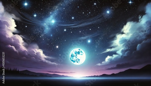 A luminous full moon surrounded by stars and clouds on a quiet night