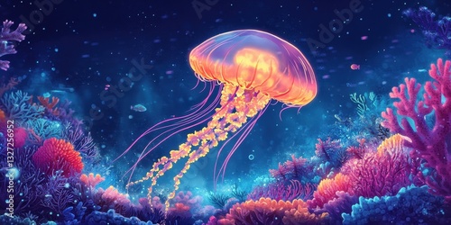 A luminous jellyfish floats above vibrant coral formations underwater