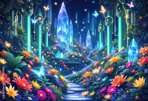 A luminous path winds through a vibrant, fantastical garden at night, illuminated by glowing crystals and bioluminescent flora,