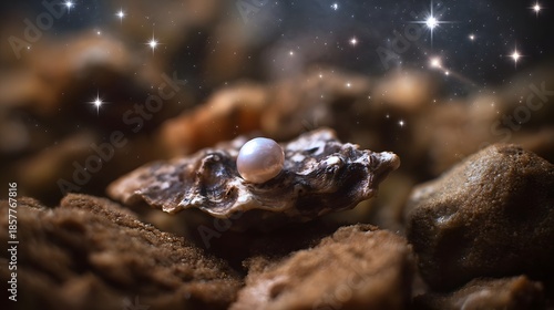 A luminous pearl rests within an open oyster shell against a backdrop of a starry night sky