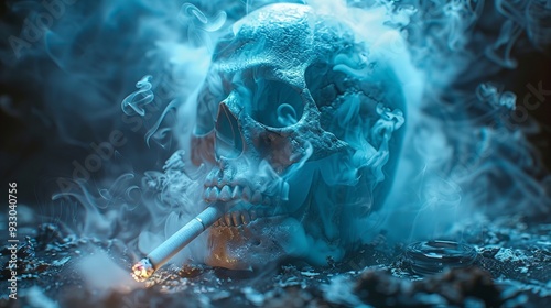 A luminous skull exhales wisps of smoke, holding a cigarette, surrounded by an eerie atmosphere that evokes mystery and intrigue