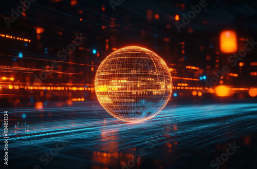 A luminous sphere is surrounded by vibrant data streams and glowing lines in a dark, futuristic setting. The scene suggests advanced technology and connectivity in a digital world.