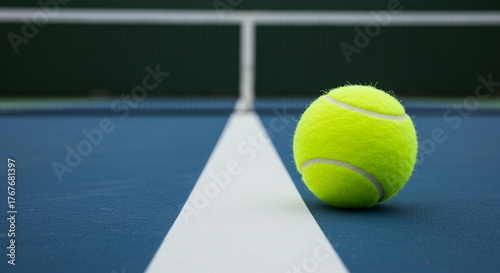 A luminous tennis ball rests perfectly poised on the court's pristine white line, under the distant tennis net.