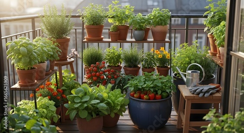 A lush balcony garden with potted herbs and vegetables representing an urban farming and sustainable lifestyle concept