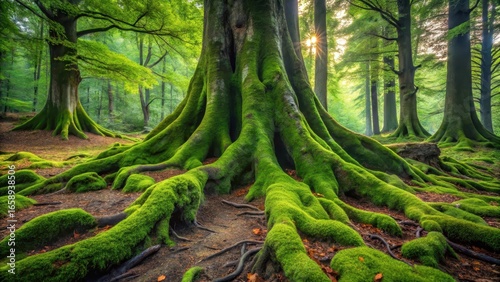 A lush carpet of moss covers the ancient tree's gnarled roots and weathered trunk
