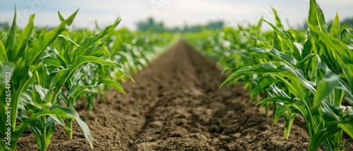 A lush cornfield stretches into the distance, showcasing vibrant green plants against a cloudy sky, with rich brown soil between the rows.