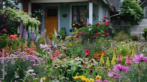 A lush flower garden with a variety of blooming plants, creating a vibrant and inviting front yard for a picturesque house.