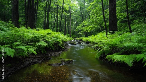 A lush forest stream flows peacefully. Perfect for nature, peace, and serenity themes.