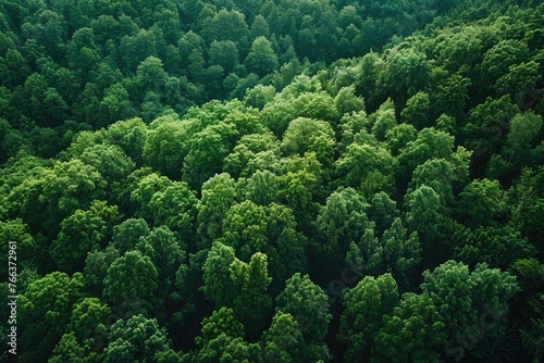 A lush green forest with trees of various sizes. The trees are densely packed, creating a sense of depth and a feeling of being surrounded by nature. Concept of tranquility and serenity