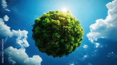 A lush green spherical island floating in a blue sky surrounded by white clouds, symbolizing eco-friendliness and environmental conservation.