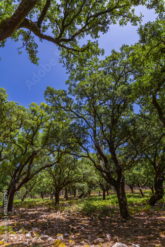 A lush oak forest canopy of tall trees creates a serene
