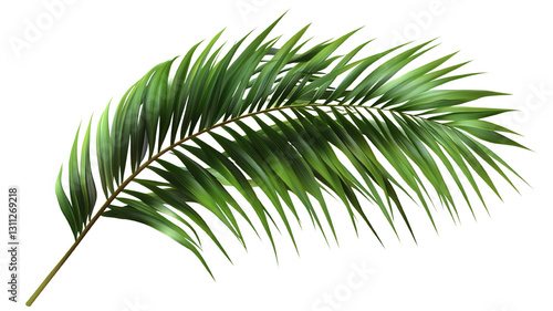 "A lush palm tree branch with vibrant green leaves, isolated on a transparent background.