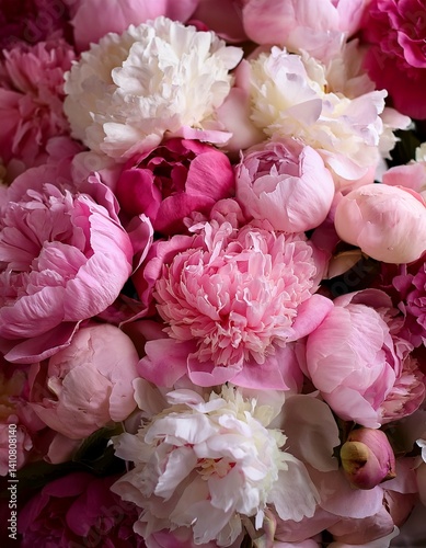 A lush peony bouquet featuring ruffled blush pink, creamy white, and deep magenta petals creates a dreamy, romantic floral display, with a sweet fragrance perfect for weddings and elegant decor.