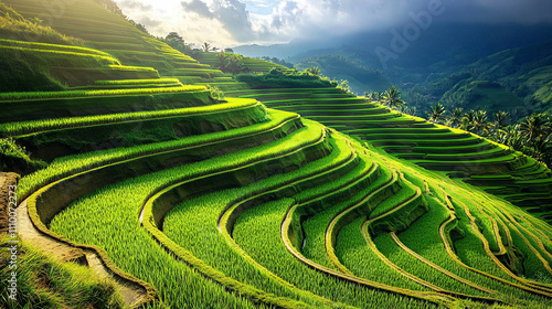A lush rice paddy field with neat, under a bright, sunny sky, green rows stretching into the horizon.