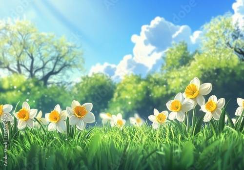 A Lush Spring Meadow Filled with Bright Yellow Daffodils Under a Clear Blue Sky with Fluffy Clouds and Sunlight Filtering Through Green Foliage