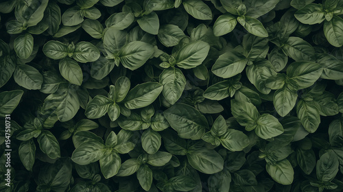 A lush, textured image of densely packed dark green basil leaves. Perfect for backgrounds, nature themes, or culinary projects. The rich, deep tones create a moody and sophisticated feel.