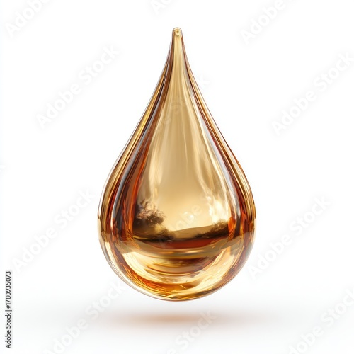 A lustrous, golden-brown liquid drop, exquisitely detailed and reflecting light, hangs suspended against a plain white background.