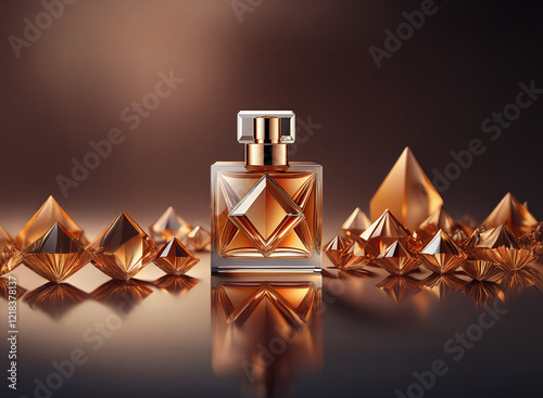 A luxurious amber perfume bottle, showcased amidst gleaming golden geometric shapes. Evokes opulence, perfect for gifting during Chinese New Year Fairs 2025.
