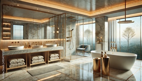 A luxurious bathroom concept with marble interior with a large freestanding bathtub.